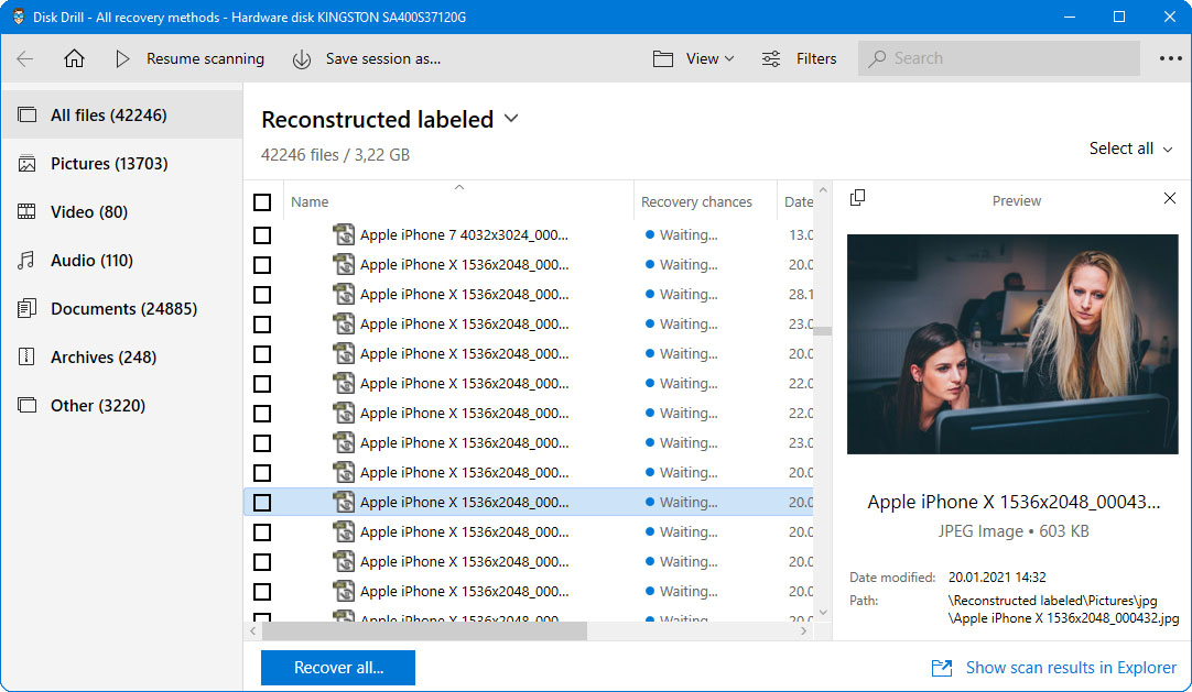 Using professional data recovery software, rebuilding disk partition table, and using winhex.